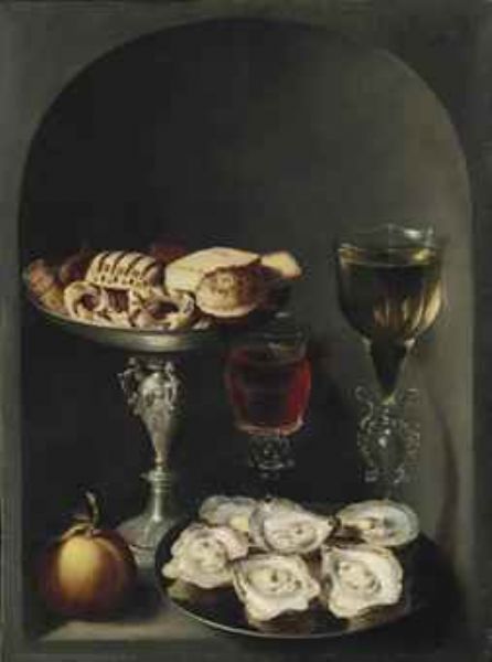 | Oysters on a pewter plate, sweetmeats and biscuits in a silver tazza, two façon-de-venise wine glasses and an orange in a niche | |