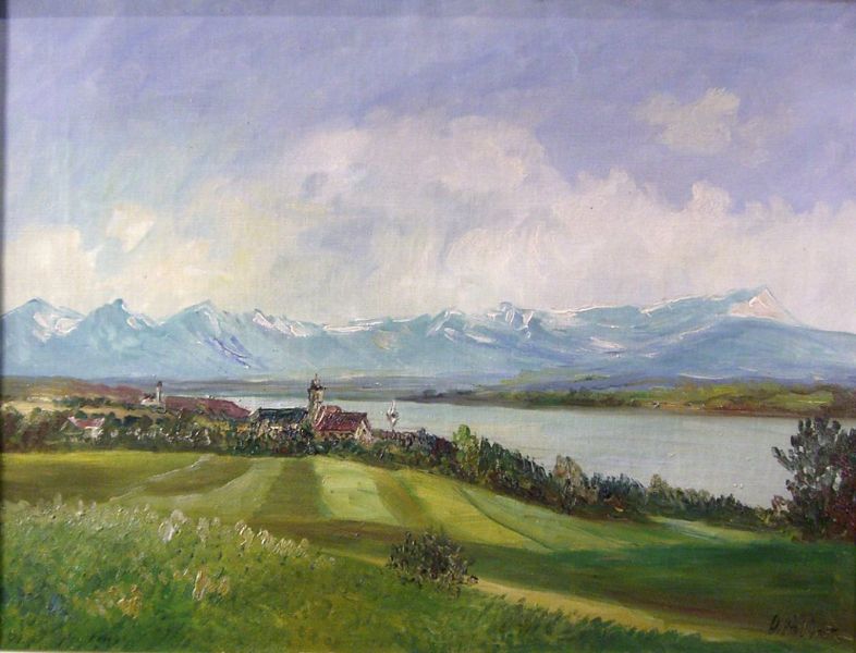 Bodenseelandschaft mit Kirchdorf und Gebirgshintergrund.