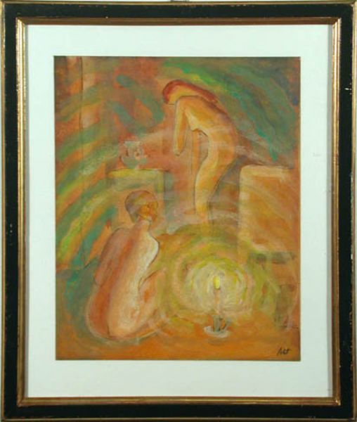 Zwei weibliche Akte im Schein einer auf dem Boden stehenden Kerze in einem Schlafzimmer