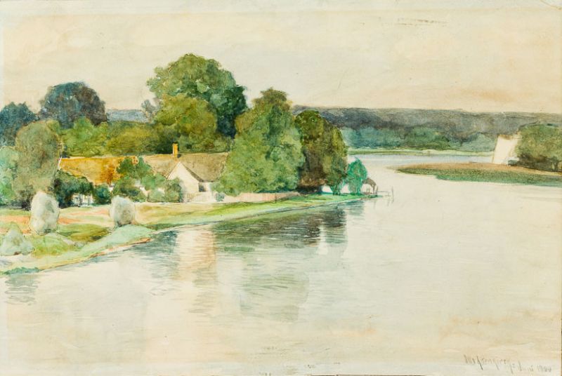 Flusslandschaft mit Bauerngehöft.