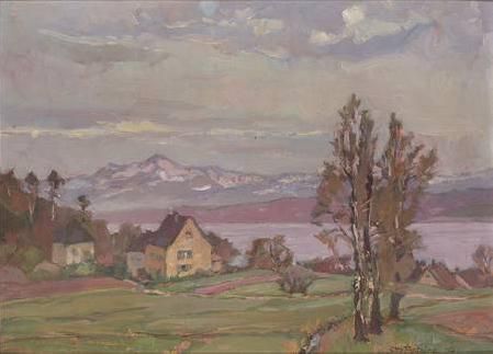 Blick von der Höhe auf See und Säntis-Massiv an einem Frühlingstag