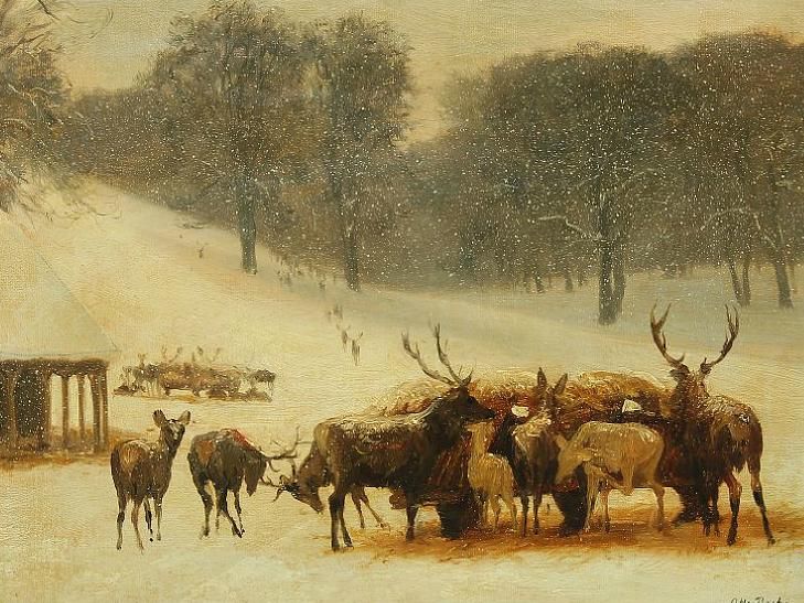 Deer by the wagon with hay, a snowy day in the Deer Park Copenhagen