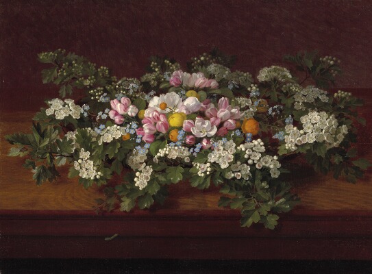 | Still life with forget-me-not, fruit branches and branches of hawthorn in bloom | |