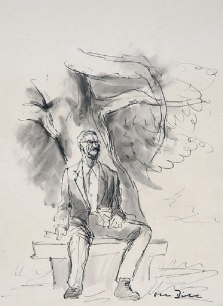 | Auf einer Bank sitzender Mann, in seiner Linken hält er ein Blatt, rechts einen Stift, im Hintergrund ein Baum | |