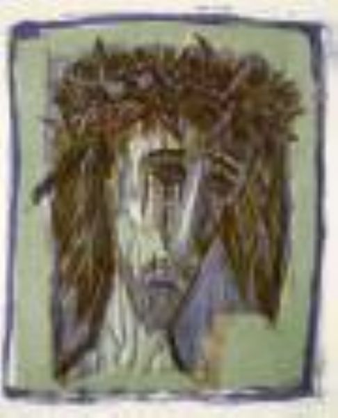 Christus (Kopf, nach rechts blickend, Haare schulterlang, dunkel auf hellem Grund)