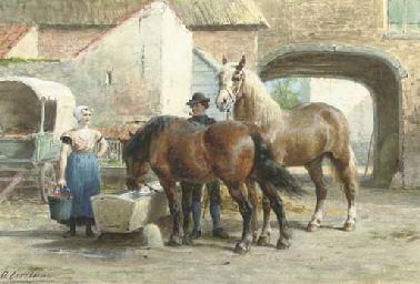 | Tending to the horses in a courtyard | |