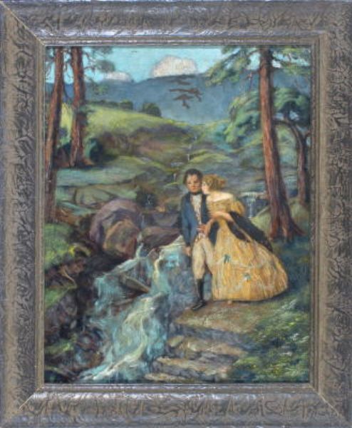 Junges Rokokopärchen an einem kleinen Wasserfall am Waldrand in Gebirgslandschaft