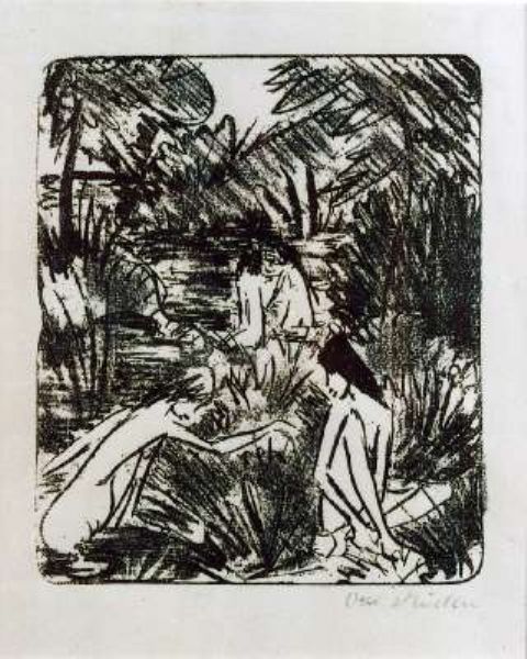 Waldsee mit drei badenden und einem sitzenden Mädchen