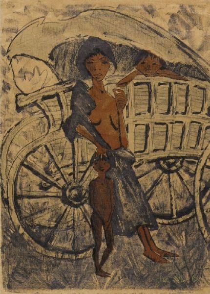 ZIGEUNERIN MIT KIND VOR DEM PLANWAGEN