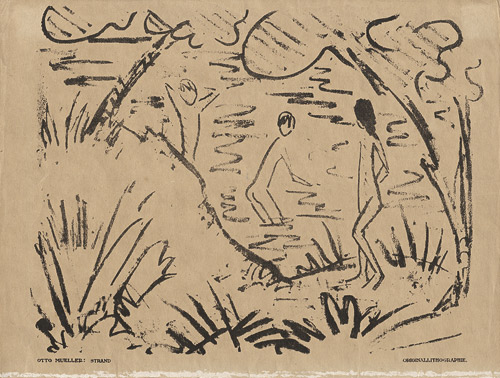 Zwei Knaben im Wasser und ein Mädchen am Ufer