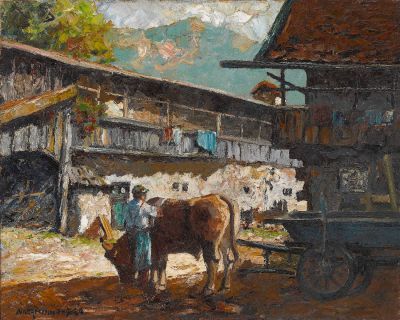 Vor dem Gehöft steht ein Bauer mit seinem Ochsenkarren.