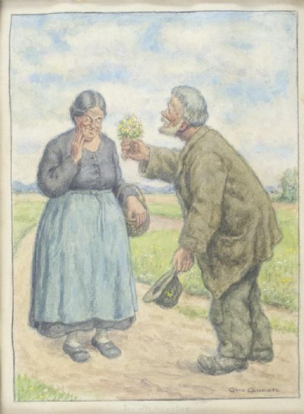 Bärtiger Alter überreicht ein Blumensträußchen.