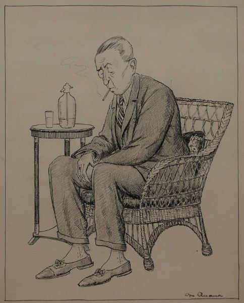 sitzender Herr im Korbstuhl mit einem Glas Wasser