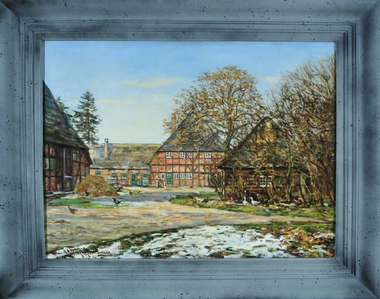 Norddeutsches Gehöft mit Federvieh im Altschnee