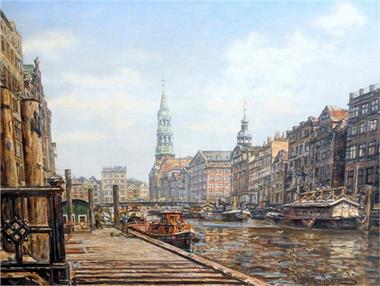 Port of Hamburg, view from the wooden bridge to the main church Sankt Katharinen