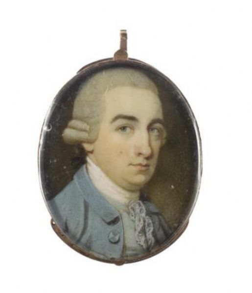 | A Gentleman, wearing pale blue coat, duck-egg blue waistcoat, white stock and lace cravat, his powdered wig worn en queue and ti | |