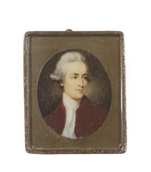 Mr Woodman, wearing brown coat, pale blue waistcoat, white cravat and powdered wig.