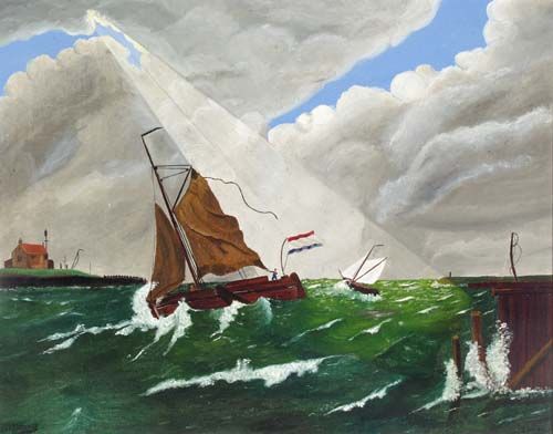 Segelschiffe in Küstennähe bei bewegter See und aufreißender Bewölkung