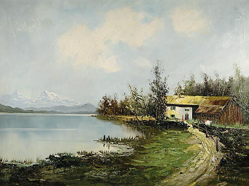 Voralpenlandschaft mit Gehöft am See, pastoser Farbauftrag