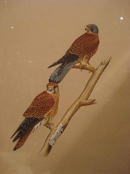 | A European gyr falcon perched on a rock; Study of two kestrels on a branch | |