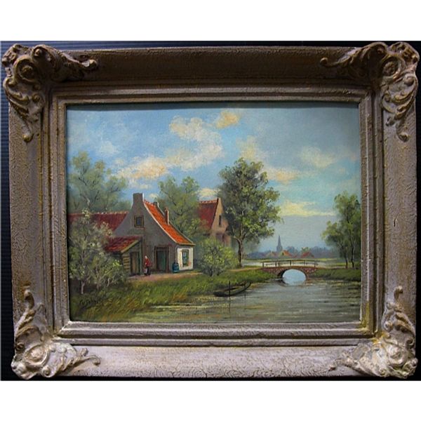 FIGURE OUTSIDE COTTAGE BY RIVER