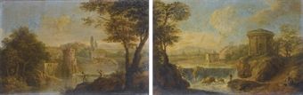 Paesaggio fluviale con pescatori; e Paesaggio con cascata e tempio circolare