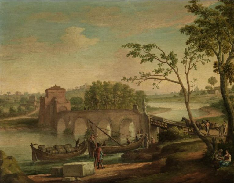 FLUSSLANDSCHAFT MIT BOGENBRÜCKE UND AM UFER ANLIEGENDEN KÄHNEN