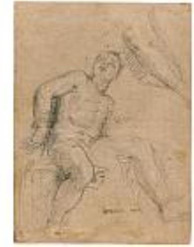 | A SEATED NUDE YOUNG MAN, LOOKING UPWARDS AND SEEN FROM BELOW, AND A DETAIL OF THE LEGS OF ANOTHER FIGURE | |