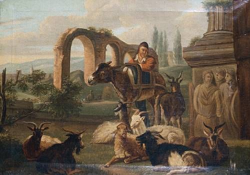| A goatherd before an open landscape with Roman ruins | |