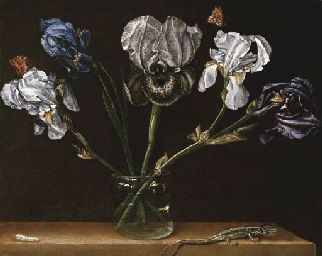 | Irises in a glass jar, a lizard and a caterpillar on a tabletop | |