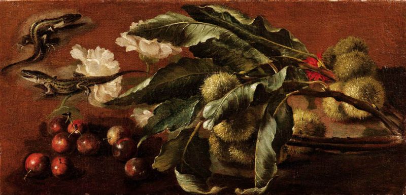 Ramo di castagno, ciliegie, rose (peonie?) e due lucertole