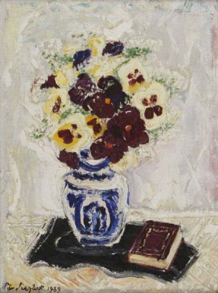 Stilleben med penséer i vas samt bok.