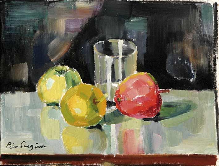 Stilleben med vas och äpplen