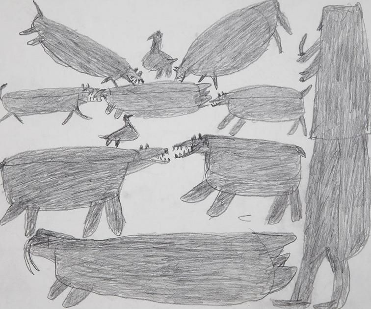 DOGS FIGHTING OVER SEAL, HUNTER, WALRUS AND POLAR BEARS