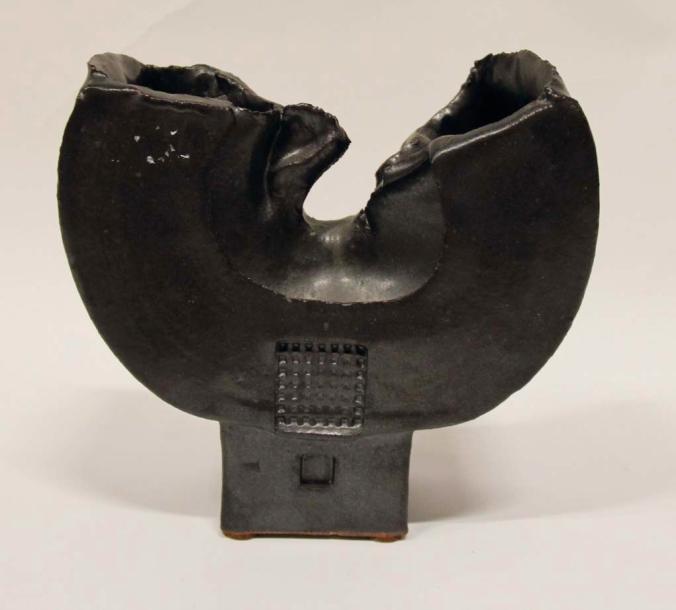 | half-moon shaped vase on a ceramic cubic base with brown glaze | |