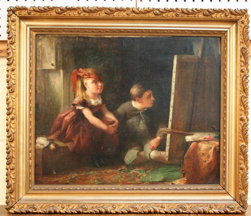 Two Children sitting at a Canvas and Artist's Palette