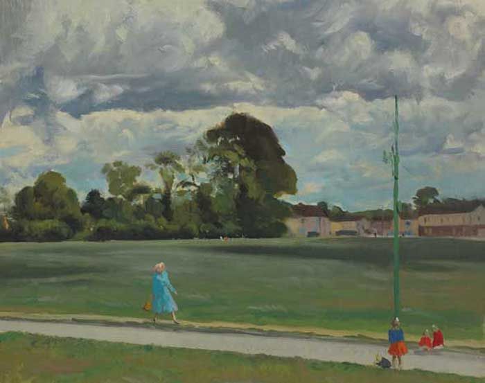 WOMAN AND CHILDREN ON A PATH WITH HOUSES BEYOND