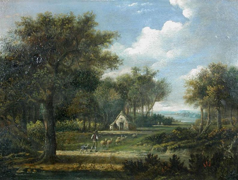 A Shepherd, Sheepdog and Sheep before a Cottage