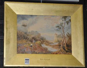 Figures by a mountain stream with distant villa