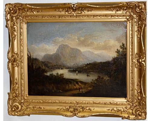 | Mountainous lake scene, with figures on a track to the foreground | |