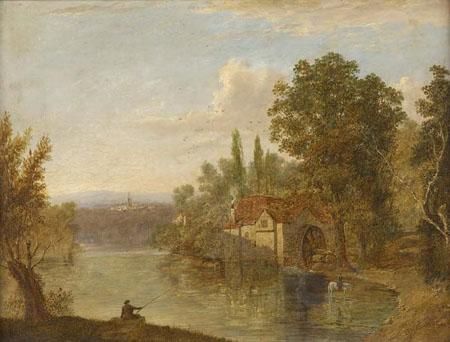 A WOODED RIVER LANDSCAPE WITH WATERMILL