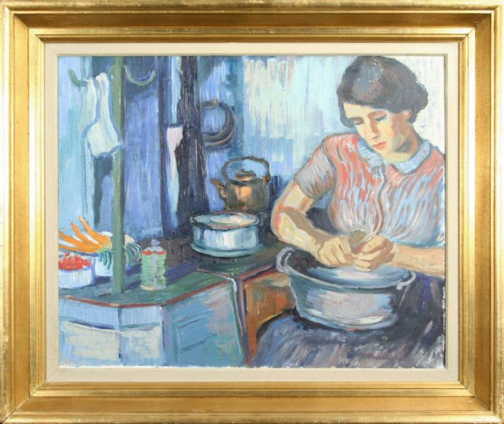Köksinteriör med skalande kvinna
