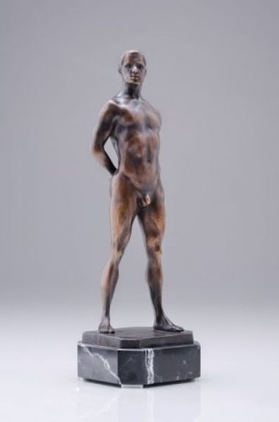 Stehender männlicher Akt mit auf dem Rücken verschränkten Armen