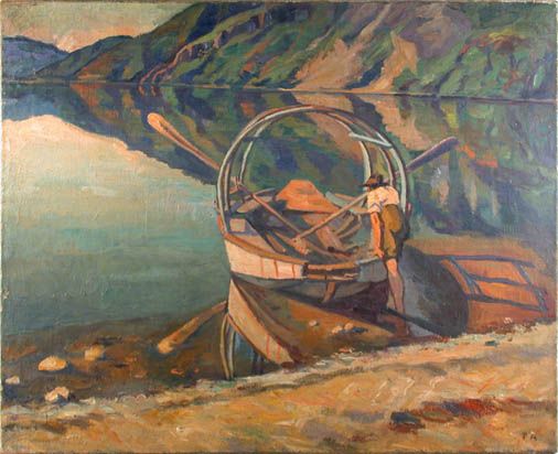 | Blick über einen See in den Bergen. Am diesseitigen Ufer ist ein Fischer dabei, seinen Nachen auf das Wasser hinauszuschieben | |