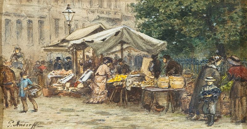 Wochenmarktstände auf dem Leipziger Platz in Berlin. Händler, Botenjunge und Damen