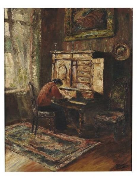 Interieur mit Dame am Schreibtisch vor geöffnetem Kabinettschrank.