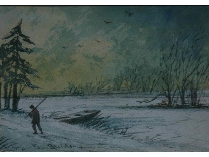 A figure by a punt in a winter landscape