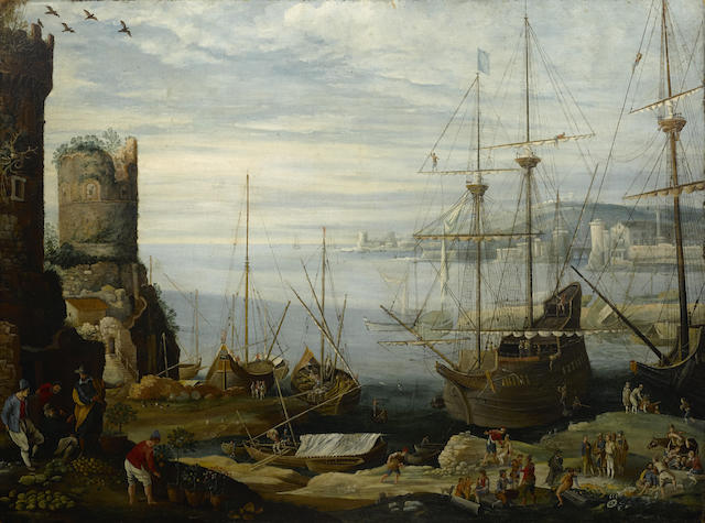 | A capriccio harbor scene with boats, ships and numerous figures in the foreground | |