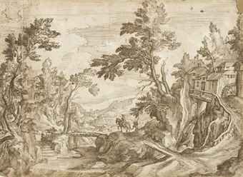 | A horseman crossing a bridge in a wooded landscape, a town beyond | |
