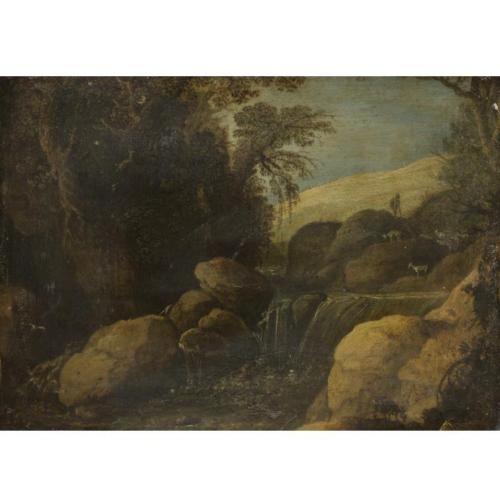 | A LANDSCAPE WITH A GOAT HERDER AND HIS FLOCK NEAR A WATERFALL | |